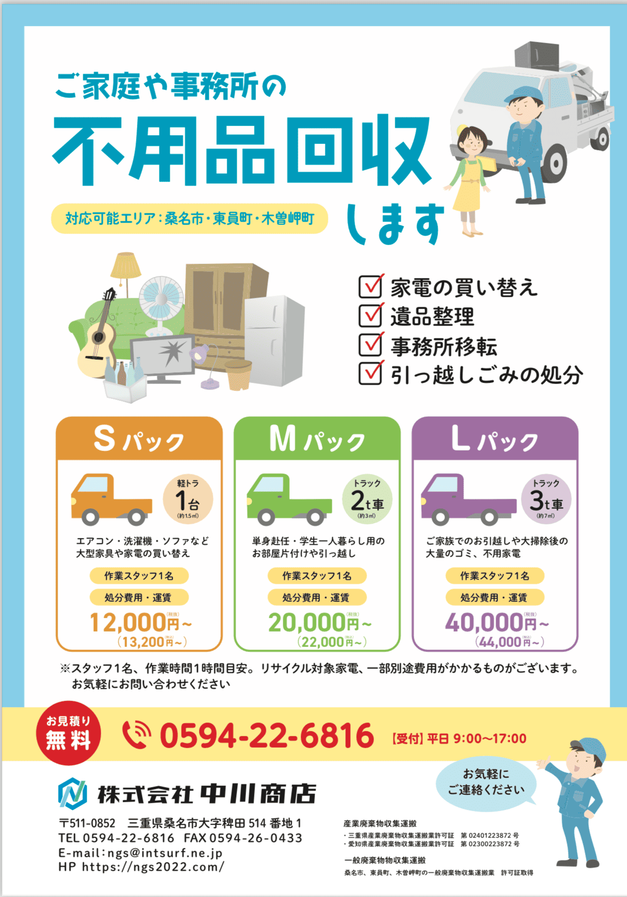 ご家庭や事務所の不用品回収します! お電話はこちら→ 0594-22-6816